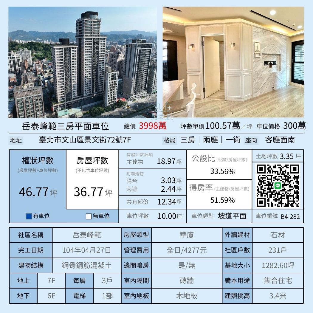 物件推薦, 最新消息, 電梯文山電梯推薦物件-岳泰峰範三房車位 Posted on 2025 年 4 月 16 日2026 年 1 月 14 日 by 丸編 新接好案文山電梯-岳泰峰範 原售價4688萬,售價降價為4288萬,再調整為3998萬! 岳泰峰範 岳泰峰範有… 繼續閱讀→